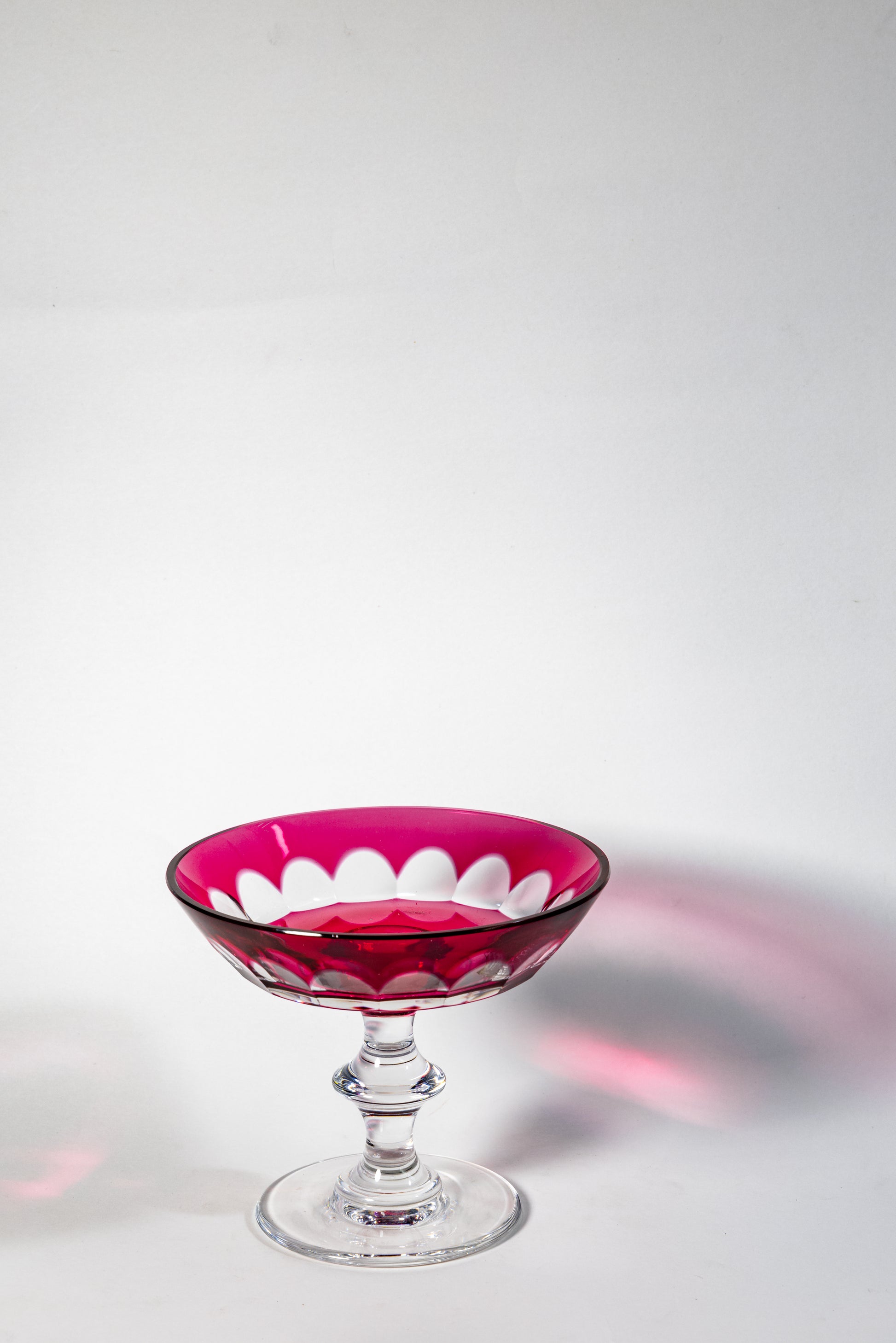This elegant cut crystal bowl by renowned Belgian glassmaker Val Saint Lambert embodies understated luxury. Crafted from richly colored cranberry-hued crystal, the bowl features a minimalist, refined cut pattern that enhances its natural brilliance without overwhelming its form.