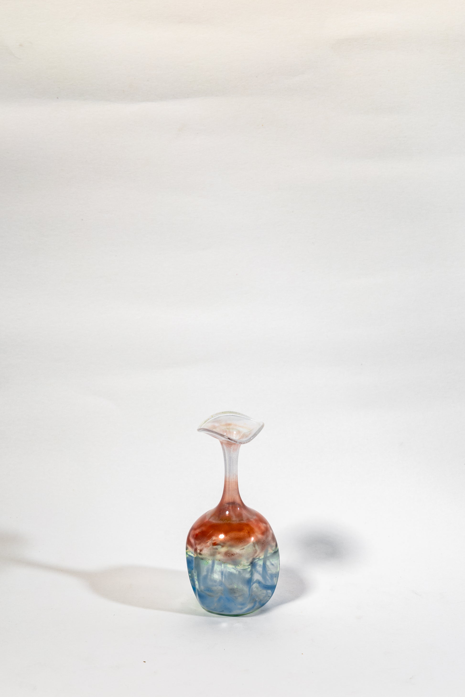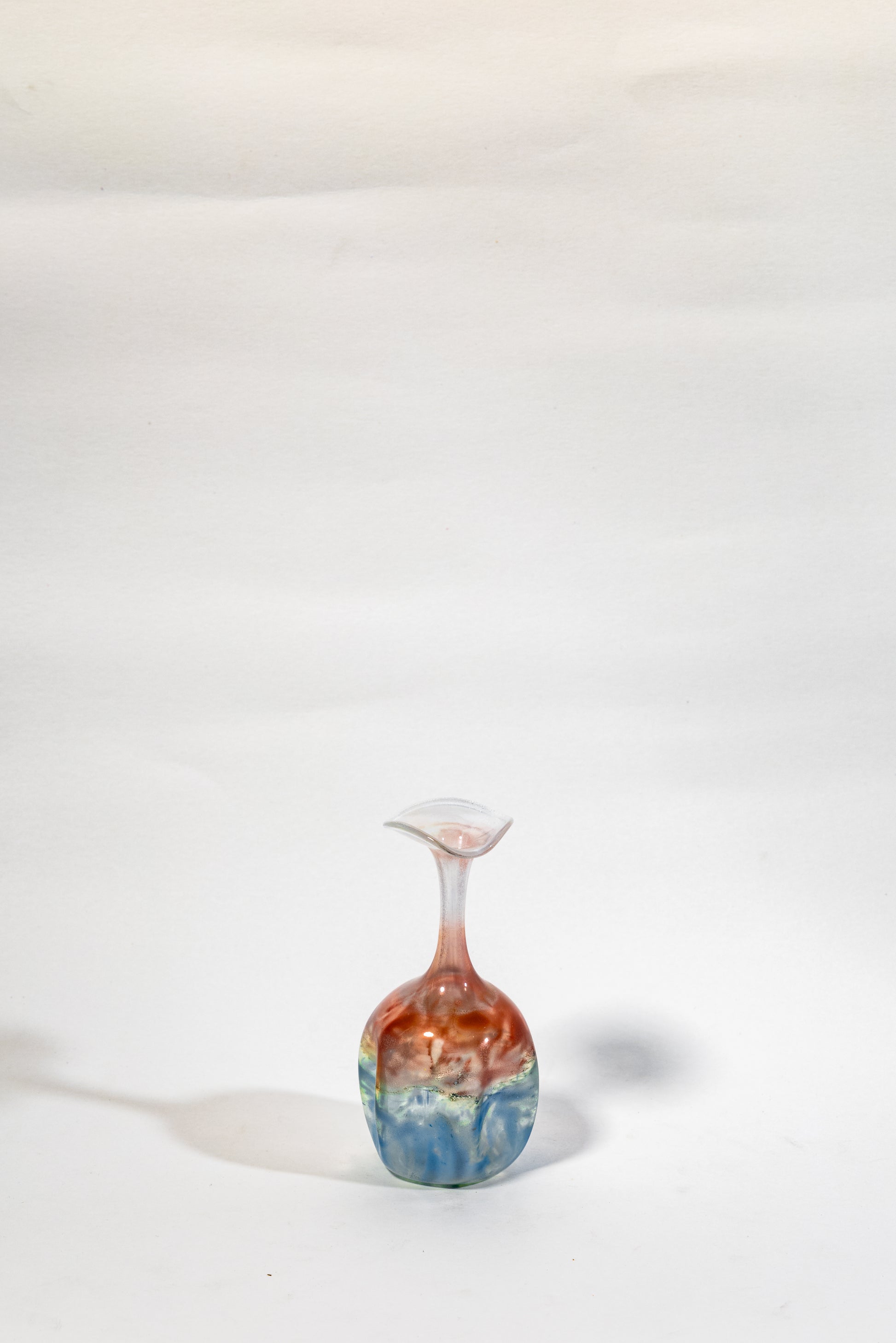 Crafted through masterful handblowing, each color melt and swirl is unique, capturing the spontaneous beauty of molten glass in motion. The piece embodies mid-century studio glass artistry, where experimentation with form and chromatic layering gave rise to timeless, organic silhouettes.