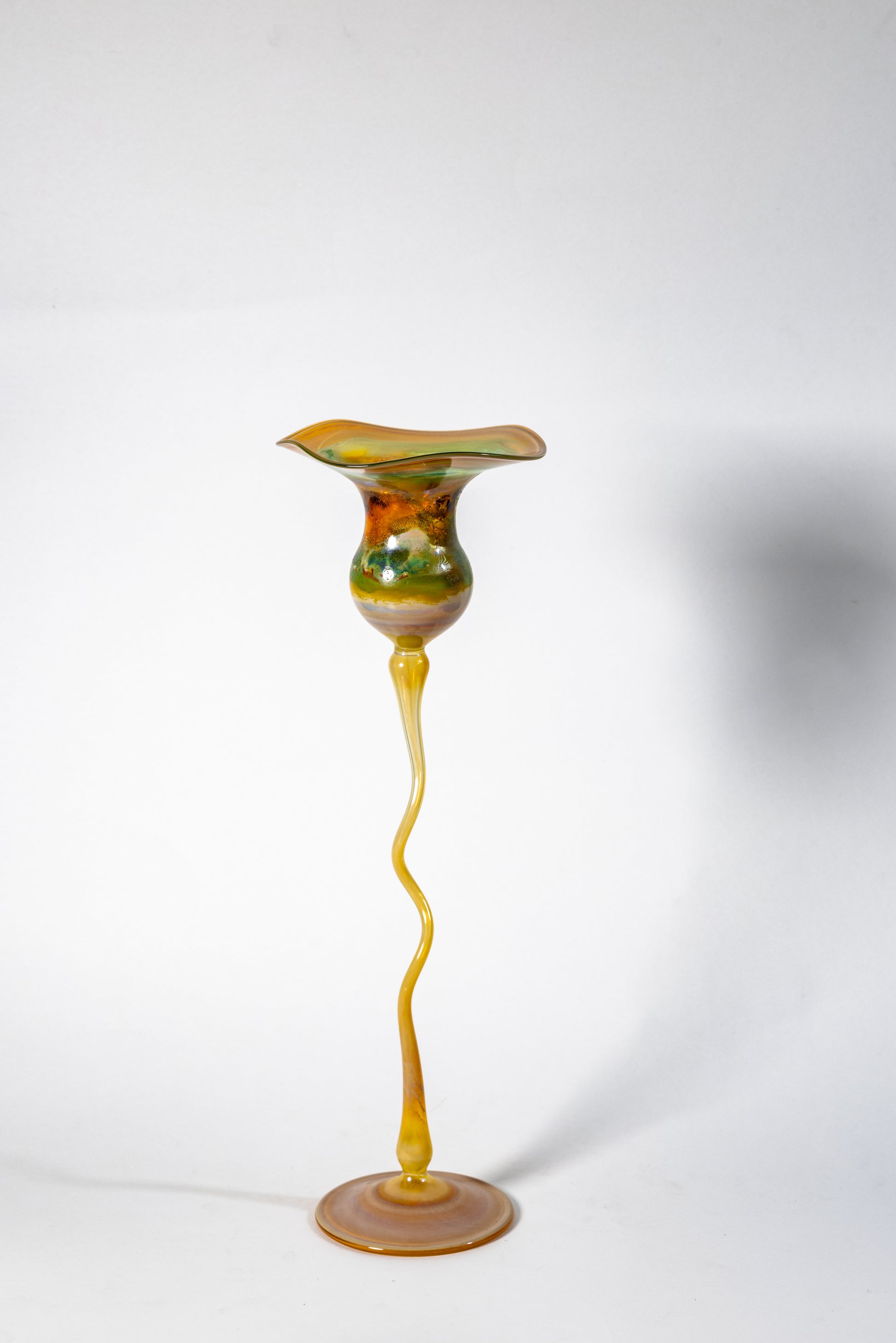 Aurora Vine rises with poetic grace — a sculptural handblown Murano glass vase of flowing form and organic rhythm. Its stem meanders upward like a living vine, crowned by a wide, flared rim that opens to reveal shimmering layers of amber, moss, and emerald hues. The surface glows with mottled iridescence, reminiscent of dawn light over Venetian waters — a testament to Murano’s mastery of glass as living color. Simply as a decorative accent on a shelf or table.