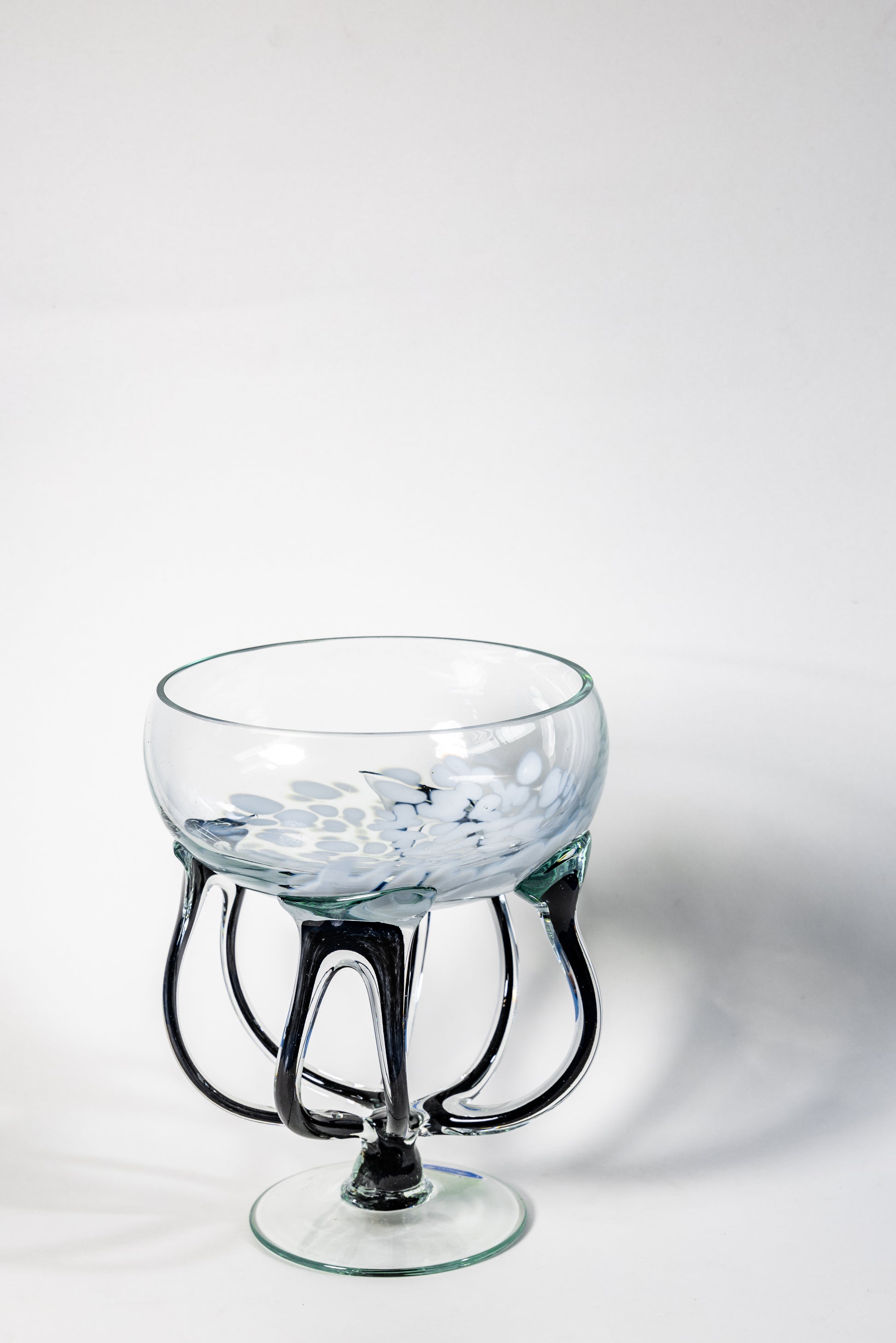 The glass captures the delicate grace of a floating jellyfish. Its clear bowl, flecked with soft white and smoky blue accents, hovers elegantly above a sculptural black glass base, as flowing tendrils form an airy lattice that seems to suspend the bowl in midair.