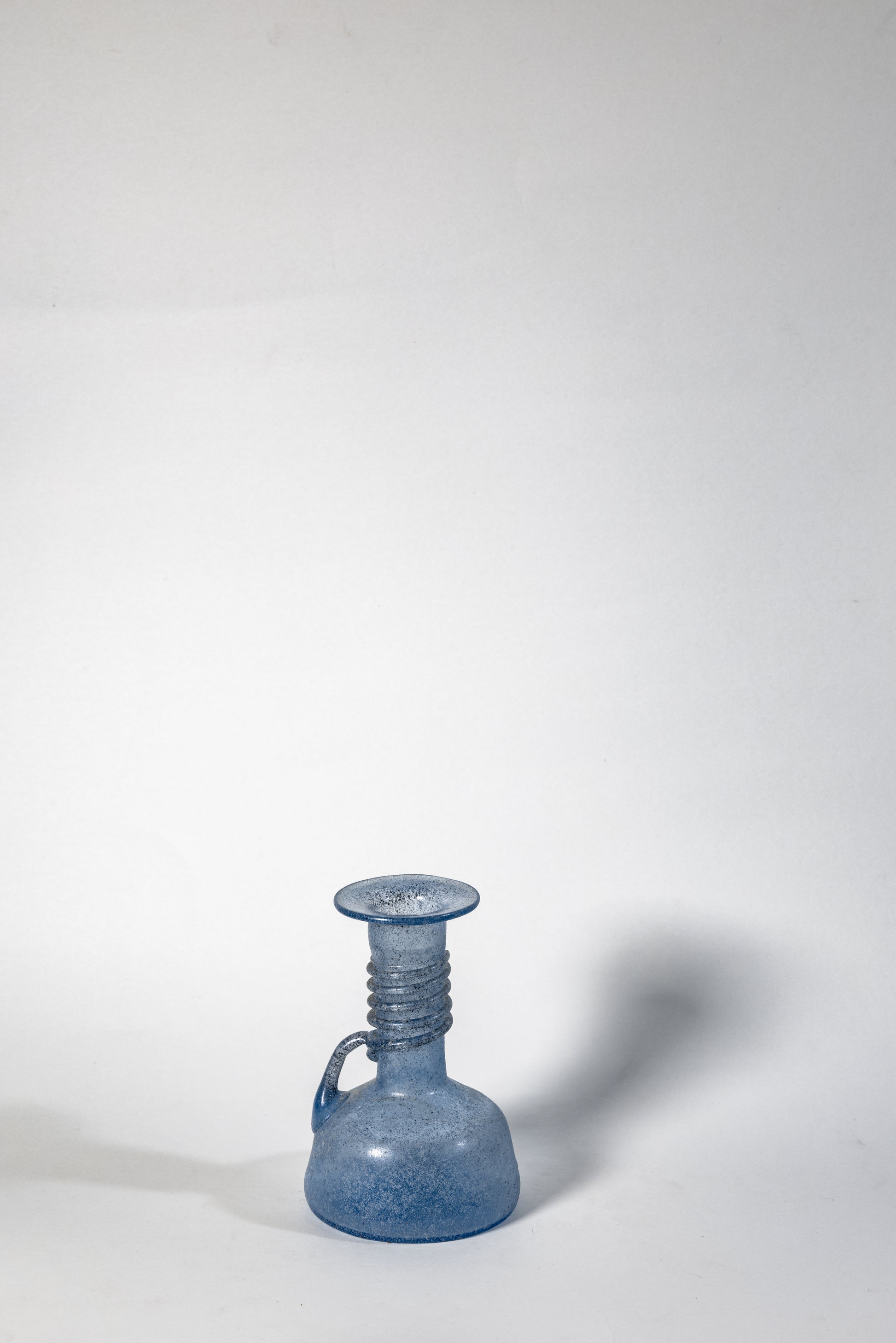 The Frosted Vase embodies the quiet sophistication of Italian mid-century glass design. Hand-blown in translucent frosted blue glass, it features a rounded base, flared rim, and a ribbed neck with a small loop handle — a harmonious balance of utility and sculpture. The surface carries a subtle grainy texture, reminiscent of sea glass weathered smooth by time.