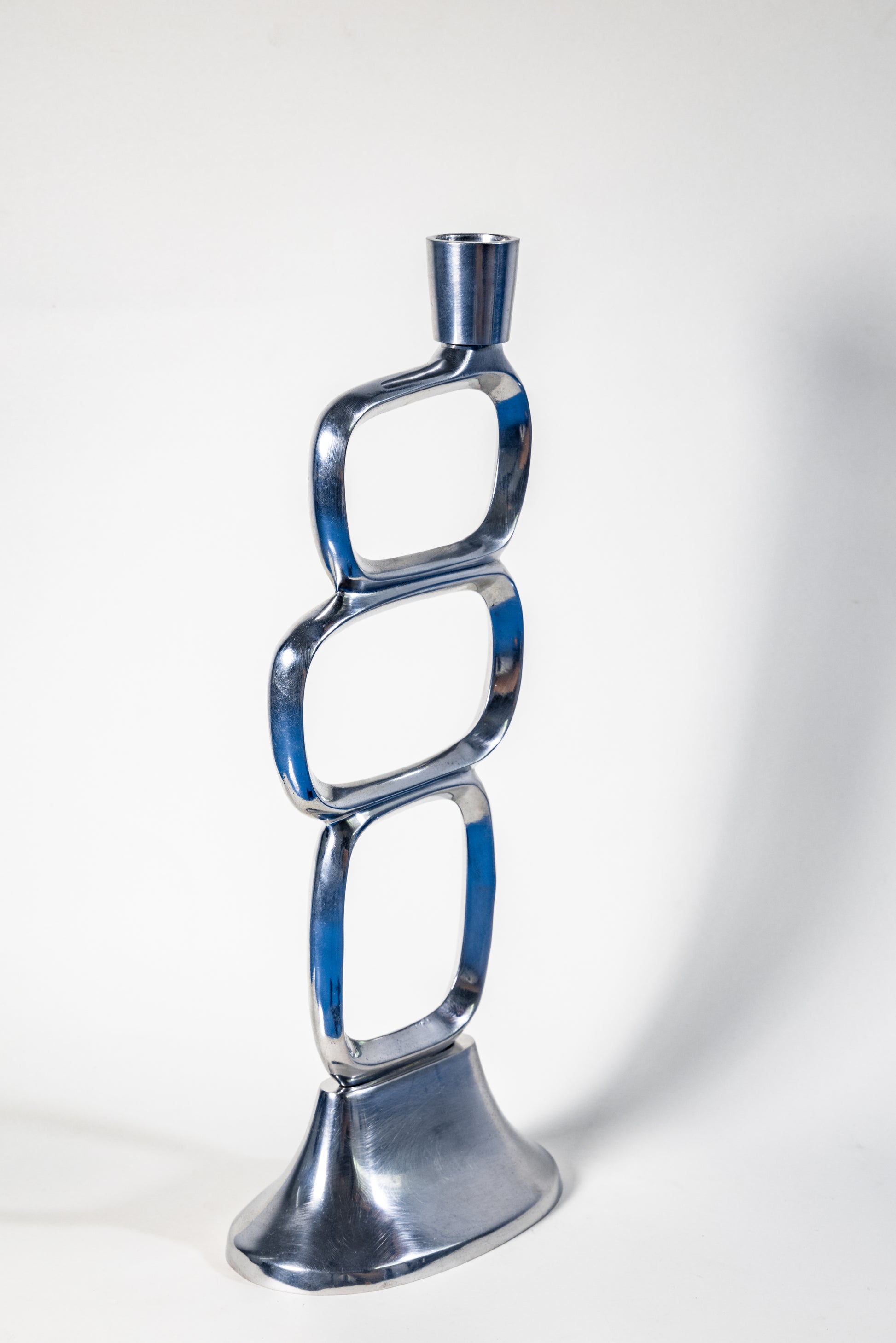 Designed by acclaimed British designer Matthew Hilton, the “Stack” candleholder is a refined expression of modern sculpture in functional form. Cast in solid polished aluminum, its interlocking, hollowed geometric shapes are stacked rhythmically to create an architectural silhouette that plays with negative space and reflection.
