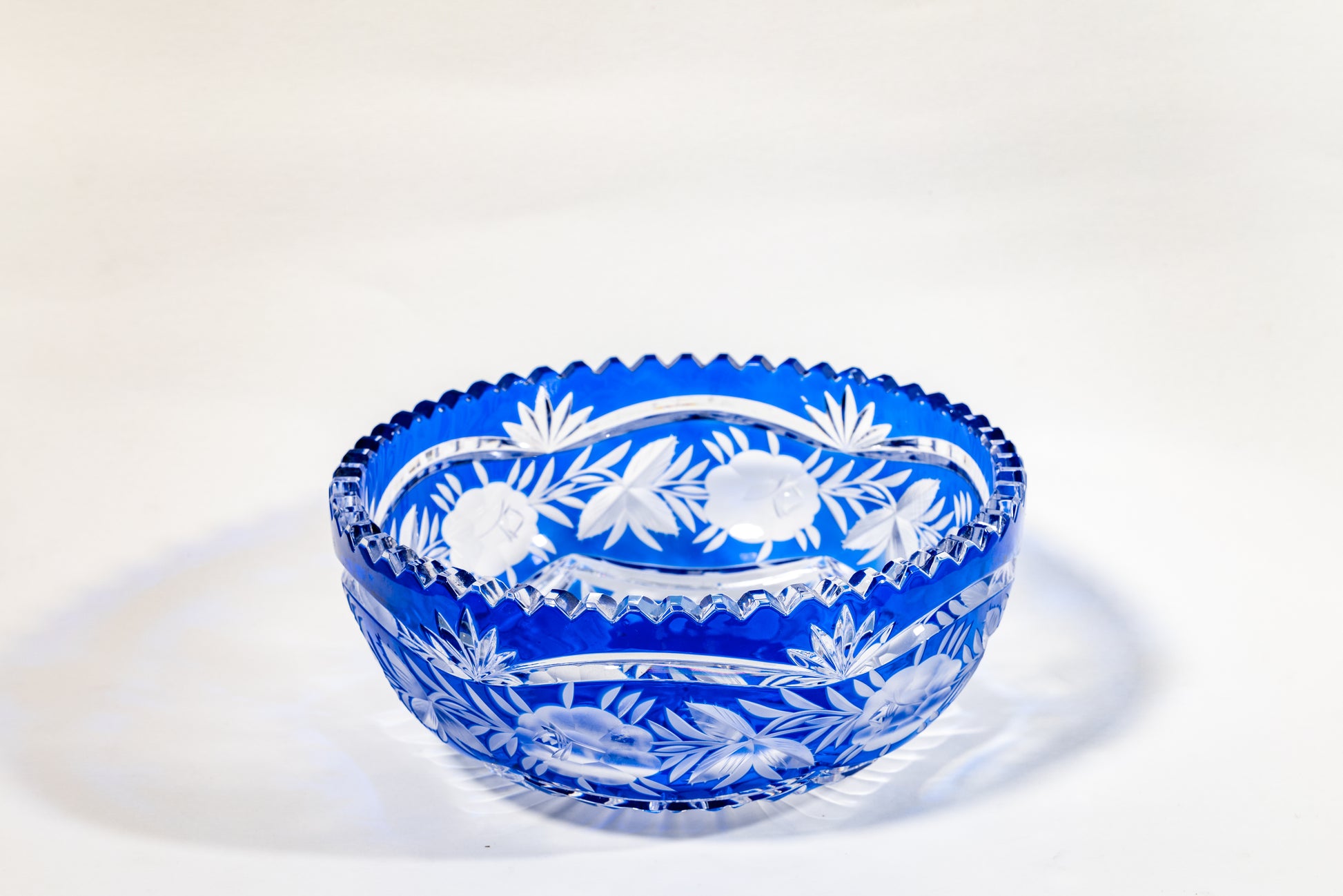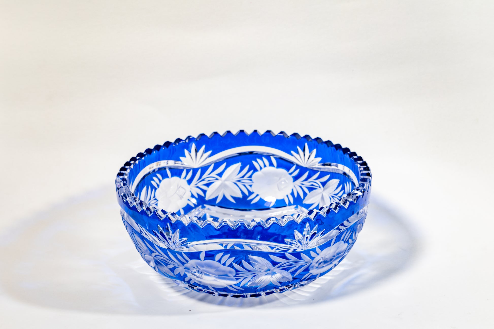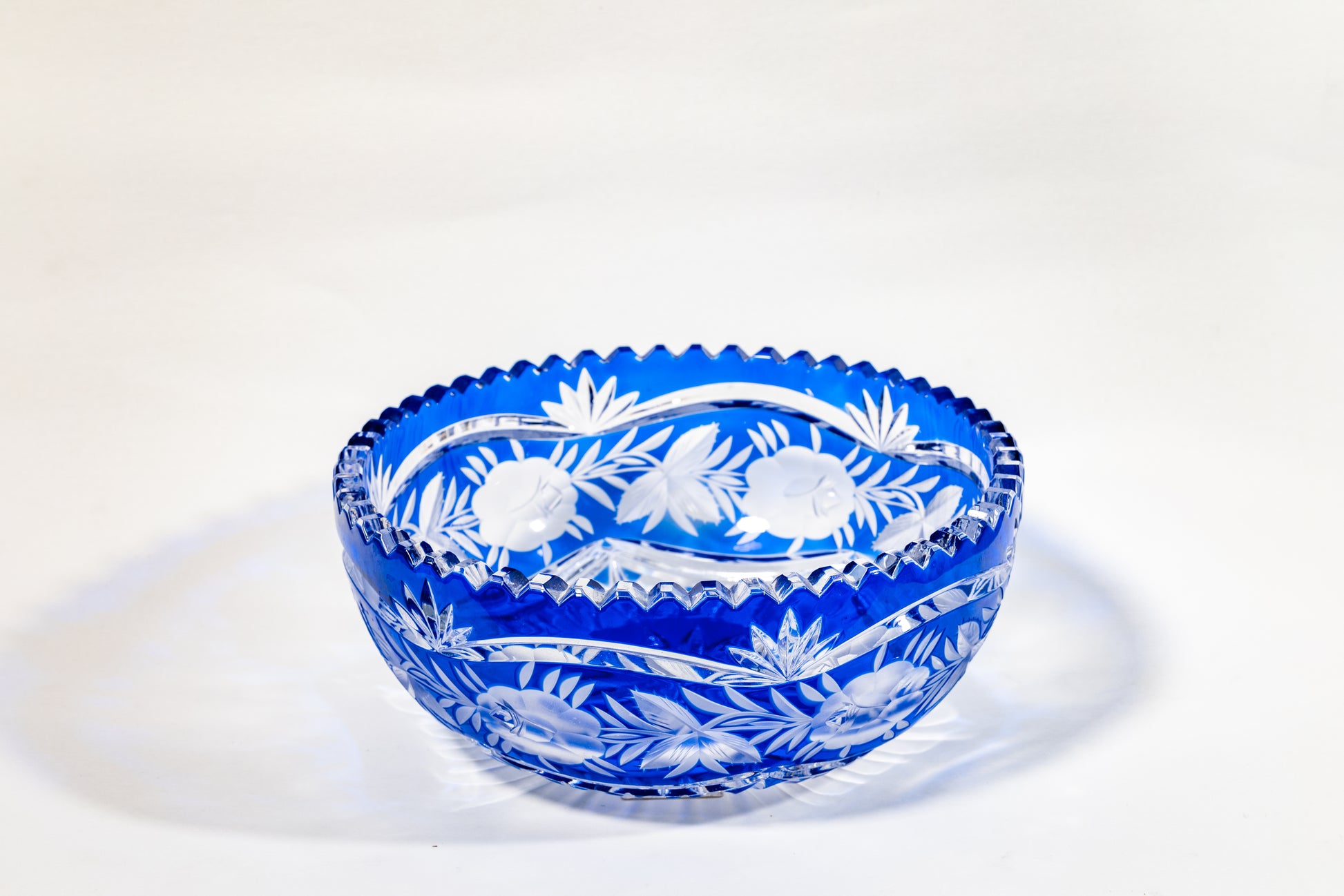 Rendered in a rich cobalt blue hue, the piece features precise wheel-cut patterns that reveal the brilliance of the clear crystal beneath. The intricate floral and geometric motifs catch and reflect the light beautifully, giving the bowl a sense of depth and luminosity.