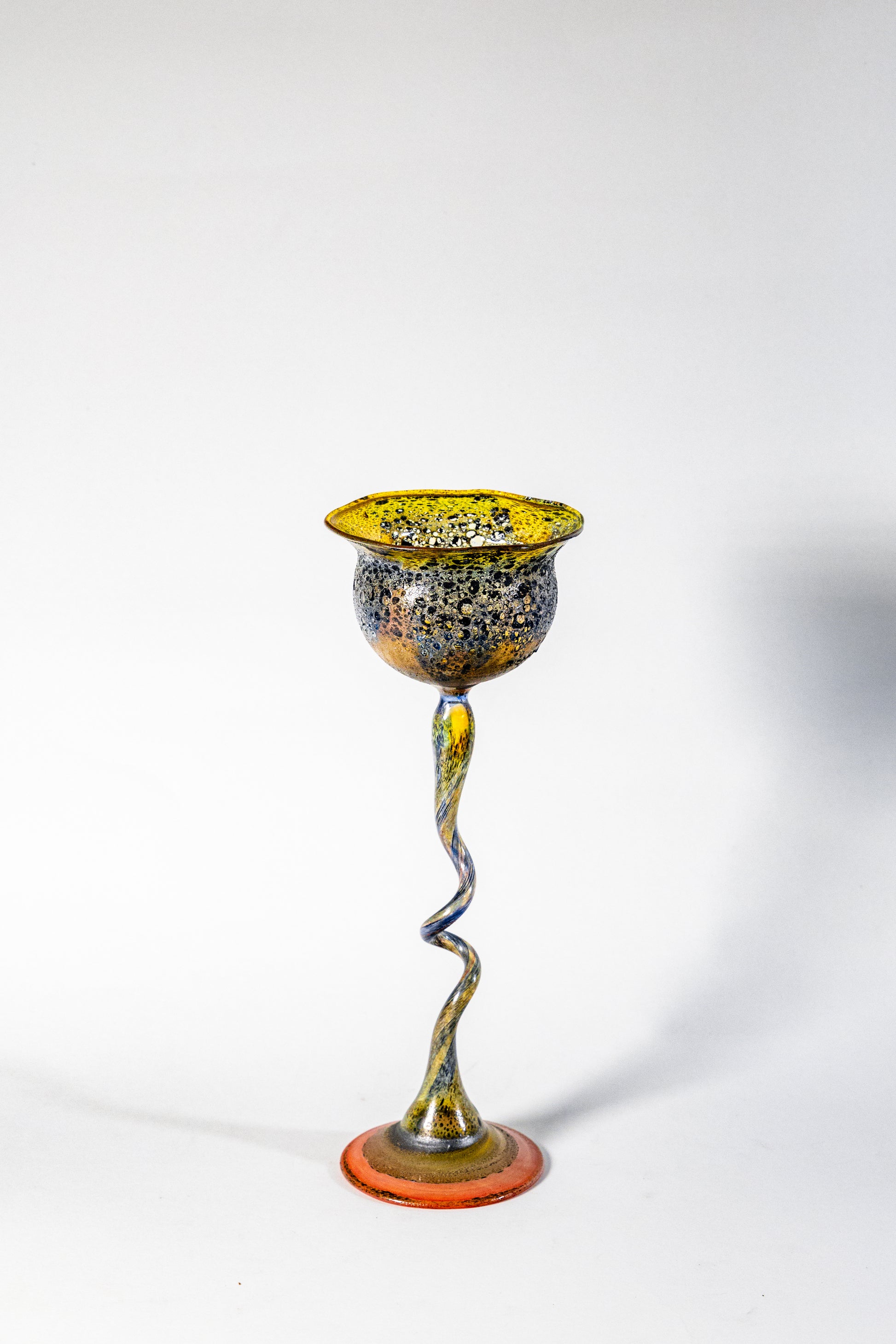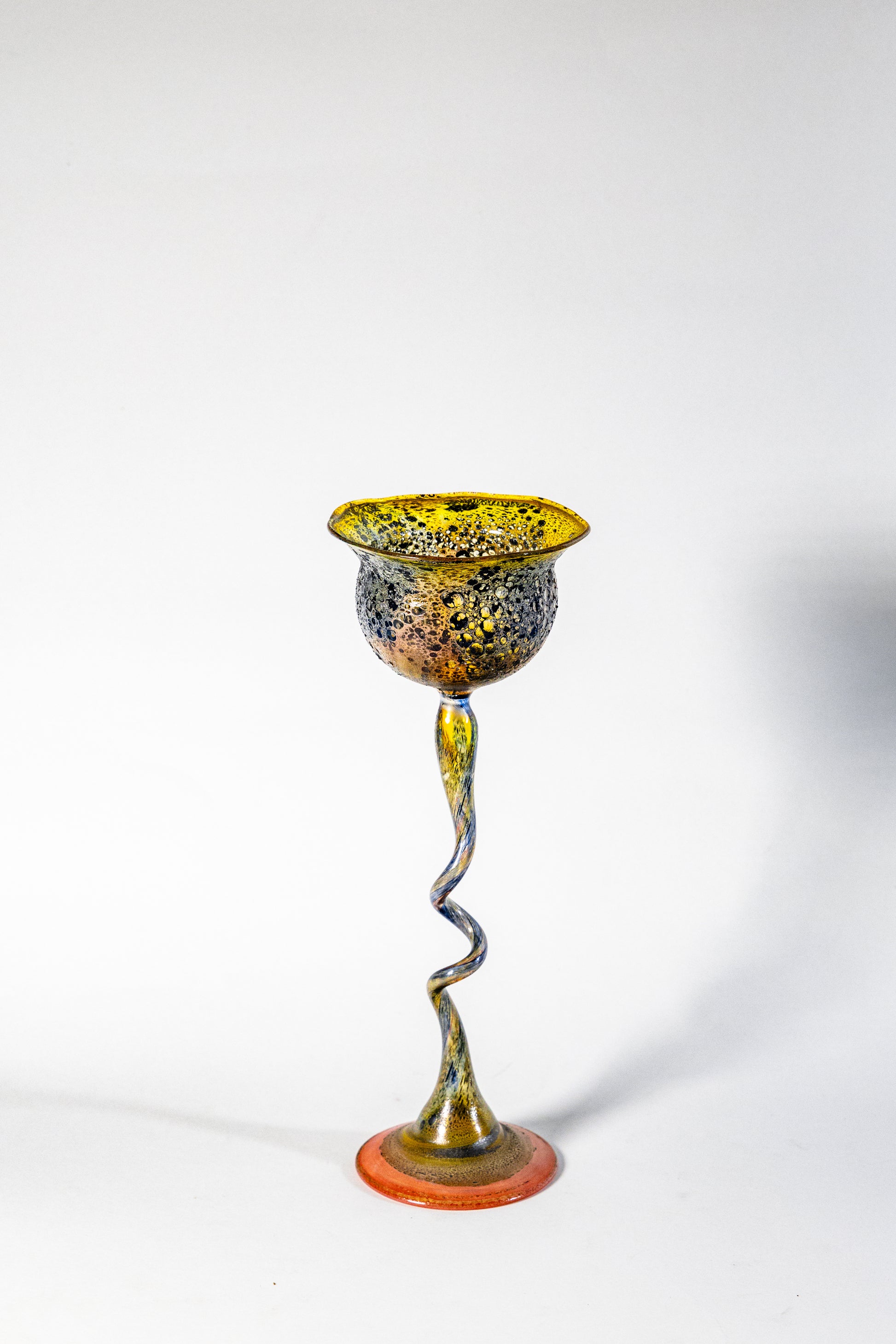 A hand-blown glass candleholder where a textured amber-yellow bowl, freckled with volcanic black and flame-red tones, rests atop a spiraling stem shaped by molten rhythm.