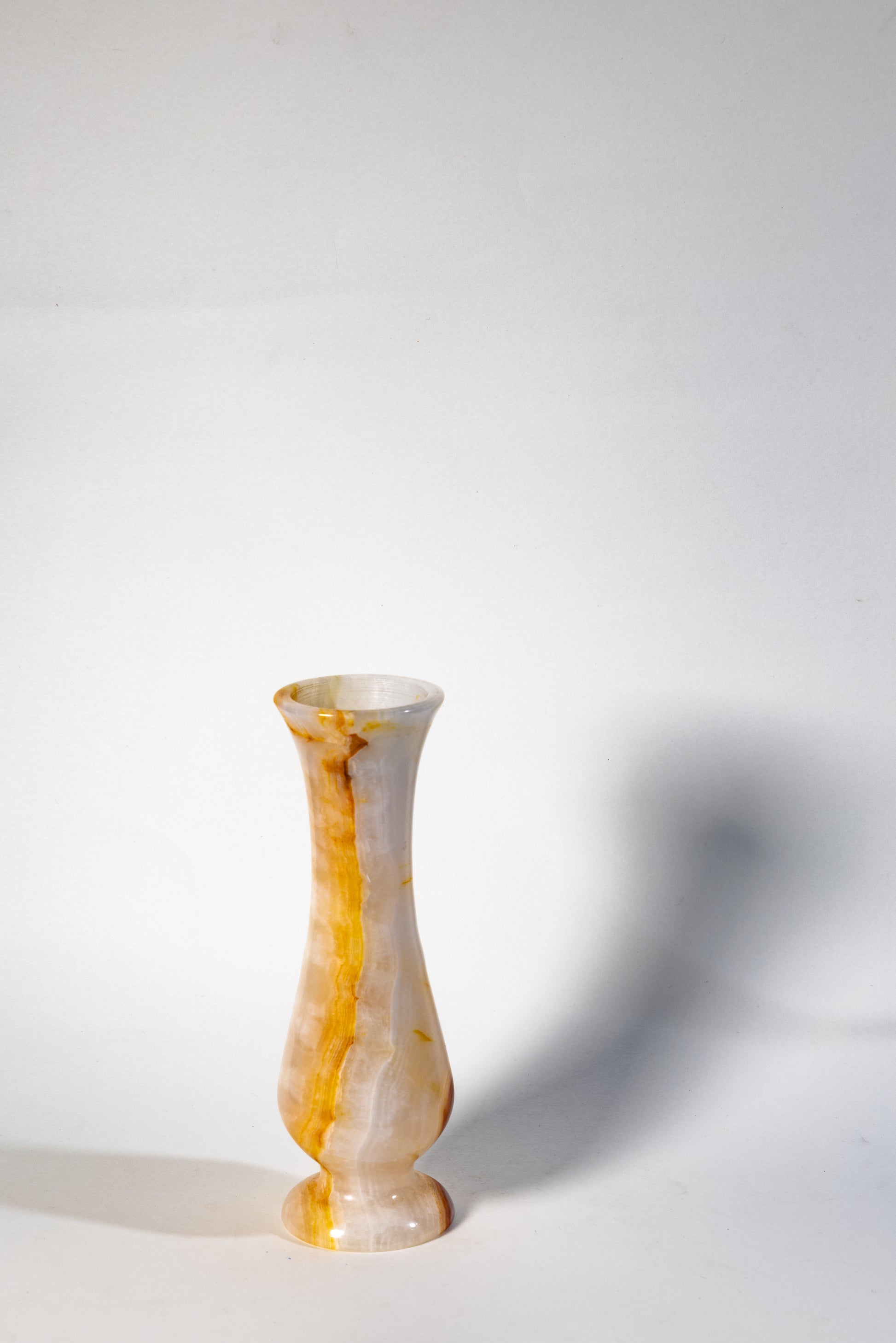 Alabastro vase embodies quiet opulence through the natural elegance of onyx stone. Hand-carved from a single block of alabaster-hued onyx, its slender fluted silhouette reveals layers of amber, cream, and gold veining that evoke rays of morning light diffused through stone. The piece’s smooth polish enhances the stone’s translucency, allowing soft light to glow warmly across its surface — a balance of solidity and serenity.