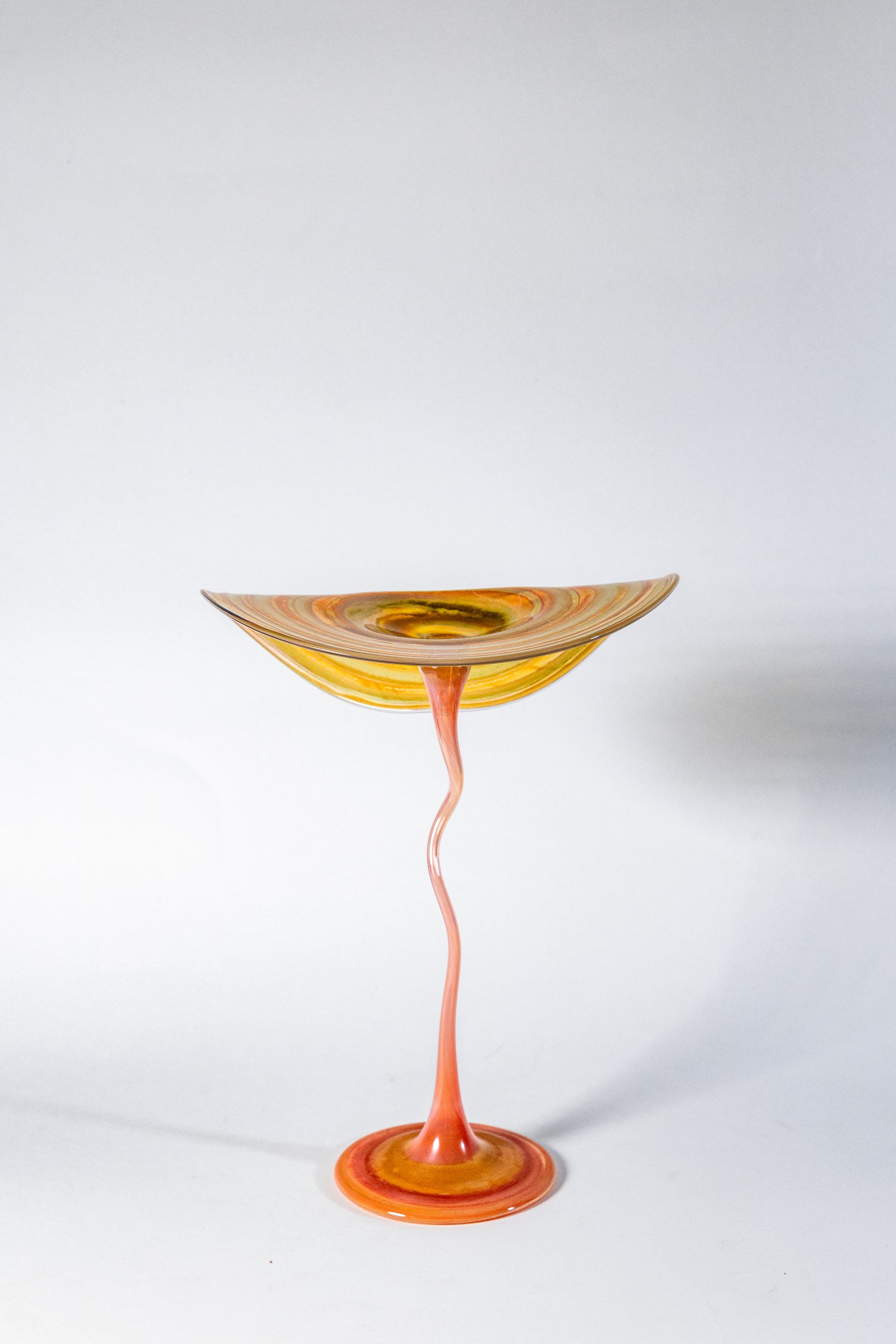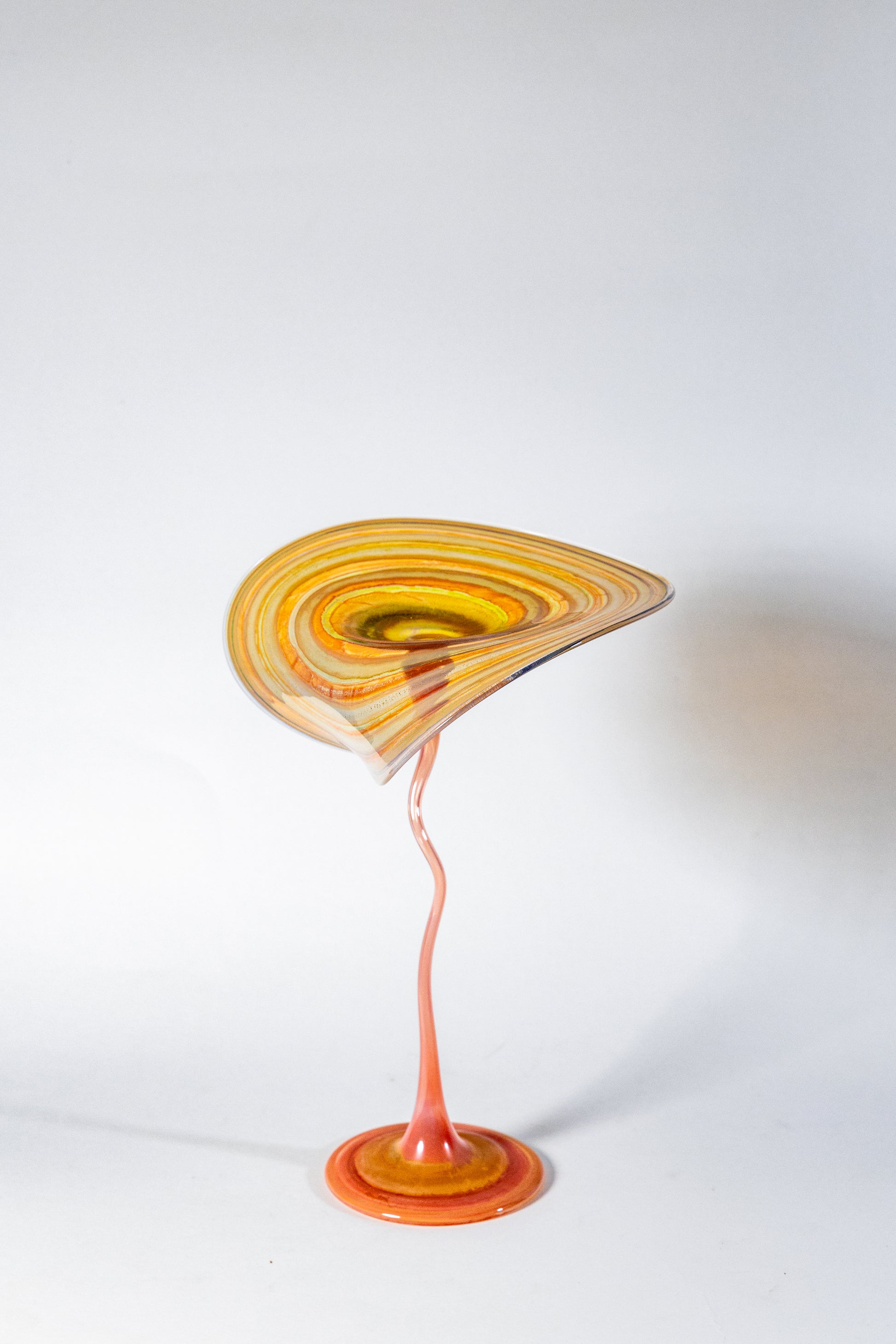 The Sole Raggiante (“Radiant Sun”) unfurls in hypnotic concentric rings of amber, honey, and apricot, delicately suspended on a flowing coral-colored stem. Its wide, organic form mirrors the warmth and rhythm of sunlight, capturing a dance of color and light within the glass.