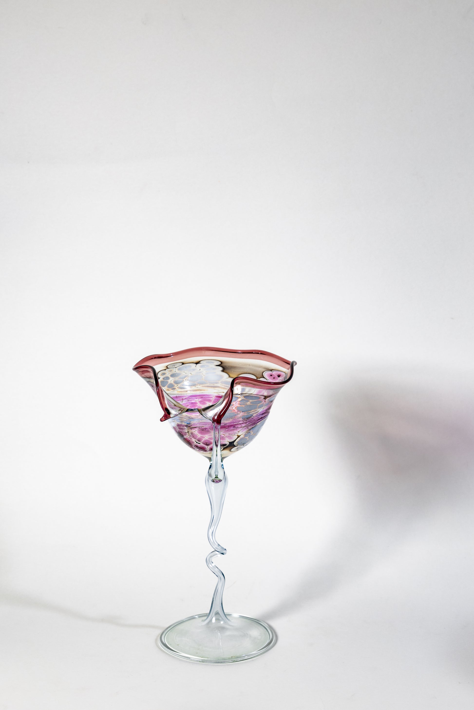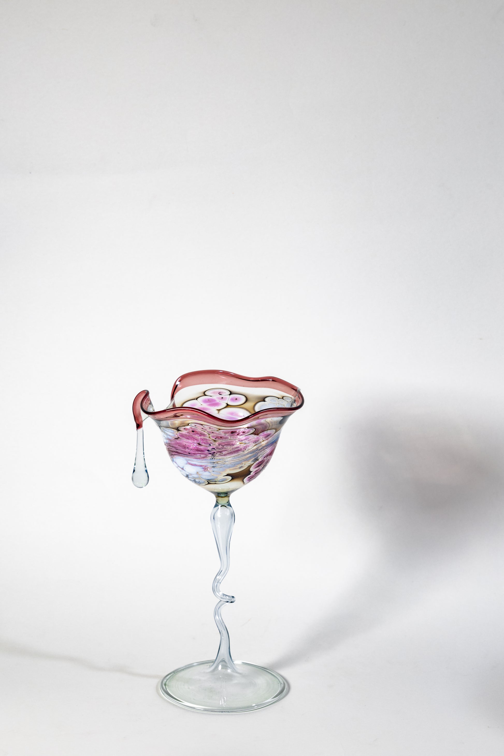 The Tear of Primavera is a lyrical composition in glass — its delicate pink millefiori blooms are suspended in translucent crystal, cascading into a single glass droplet that seems to melt from the rim. The wavy mouth and serpentine stem mirror organic motion, as if the piece itself is in gentle bloom. Ethereal and sculptural, it captures the essence of spring frozen in fluid form.