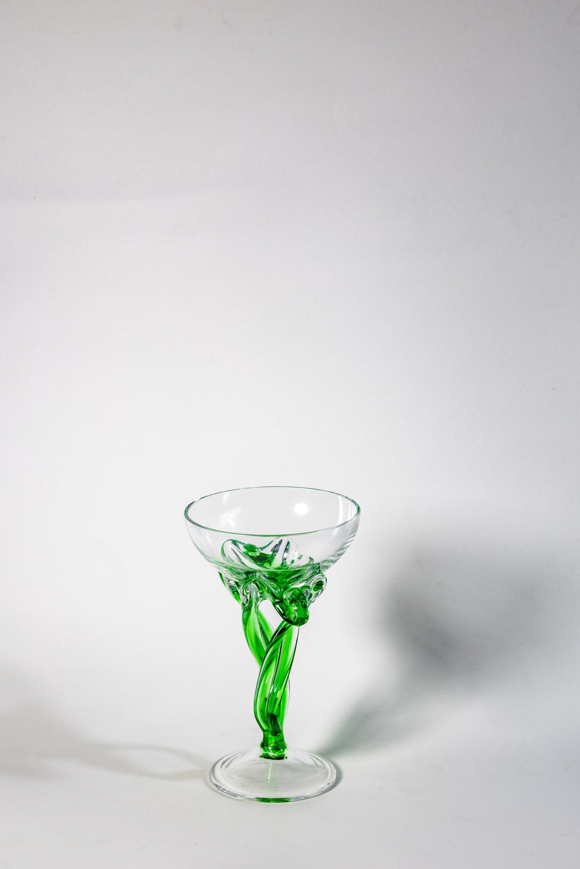 The Verdant Twist Chalice captures the vitality of nature in glass. Its vibrant green twin-spiral stem rises gracefully, intertwining like fresh shoots reaching for sunlight, while a clear, airy bowl hovers above, echoing the elegance of a drifting jellyfish.