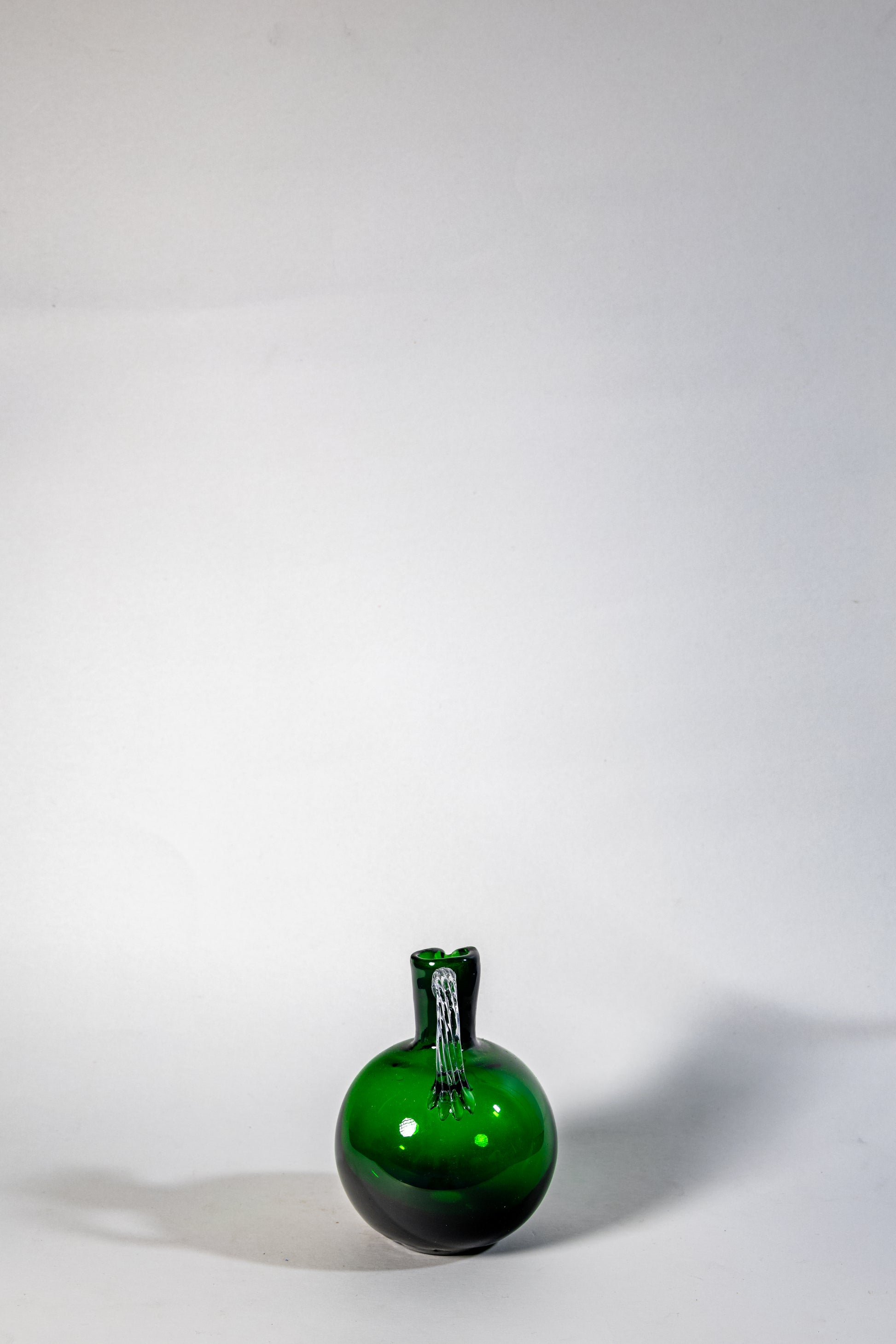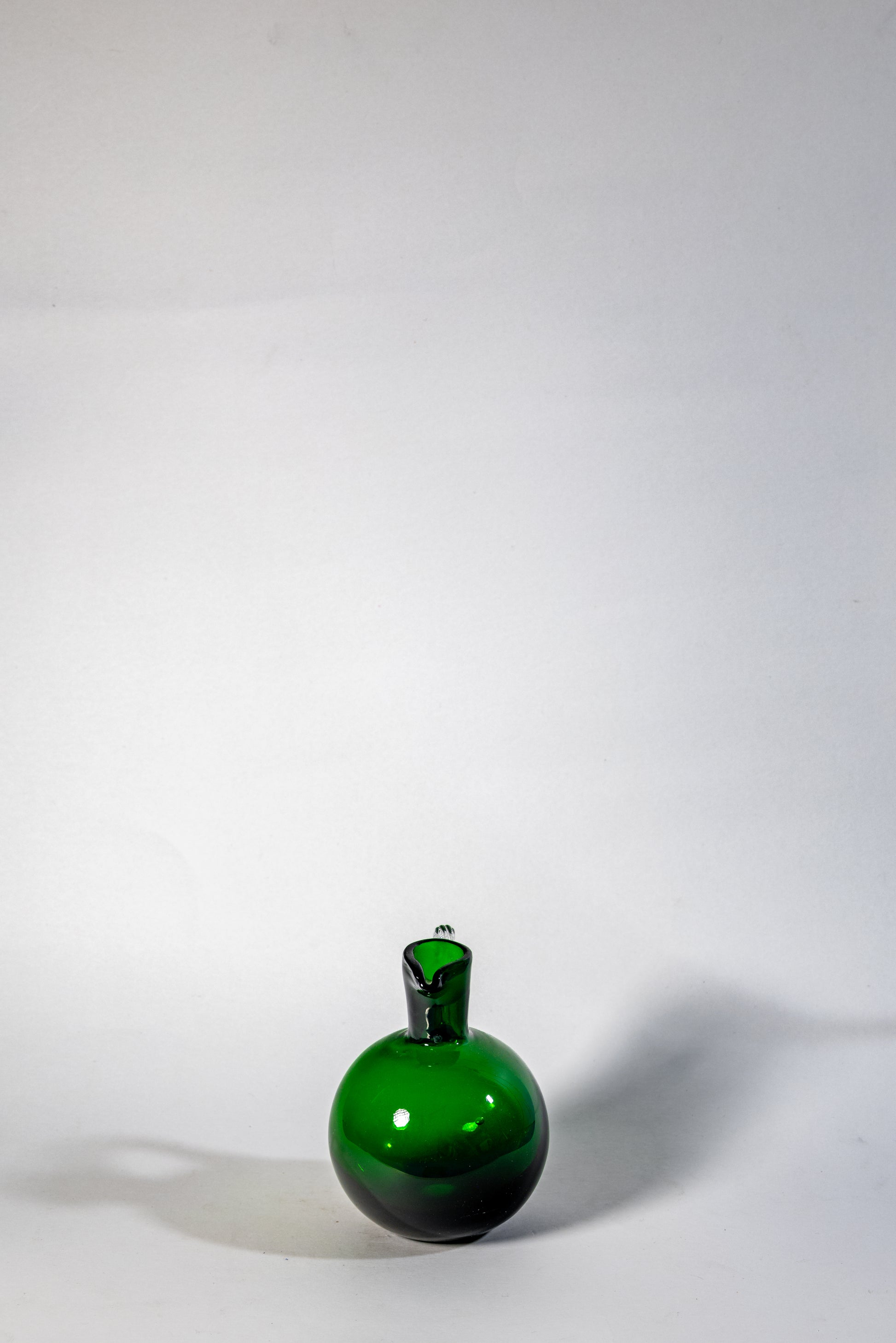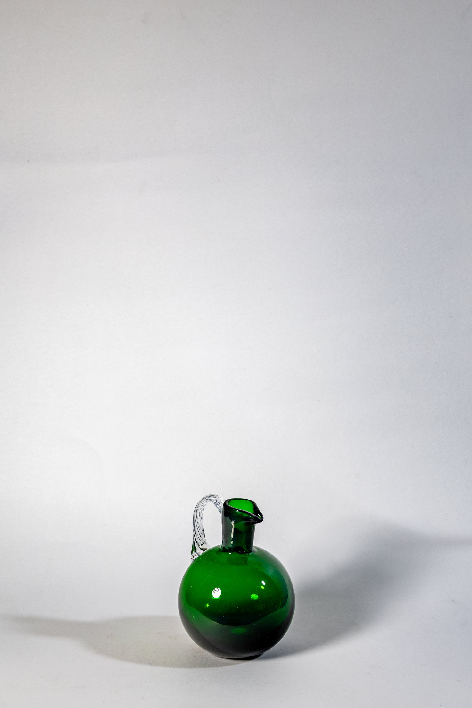 Handblown from richly pigmented emerald glass, this petite pitcher captures the depth of forest light and shadow. The spherical body gathers light within, while its clear twisted handle adds a crystalline counterpoint to the dense hue. The organic spout and slight asymmetry reveal the maker’s hand